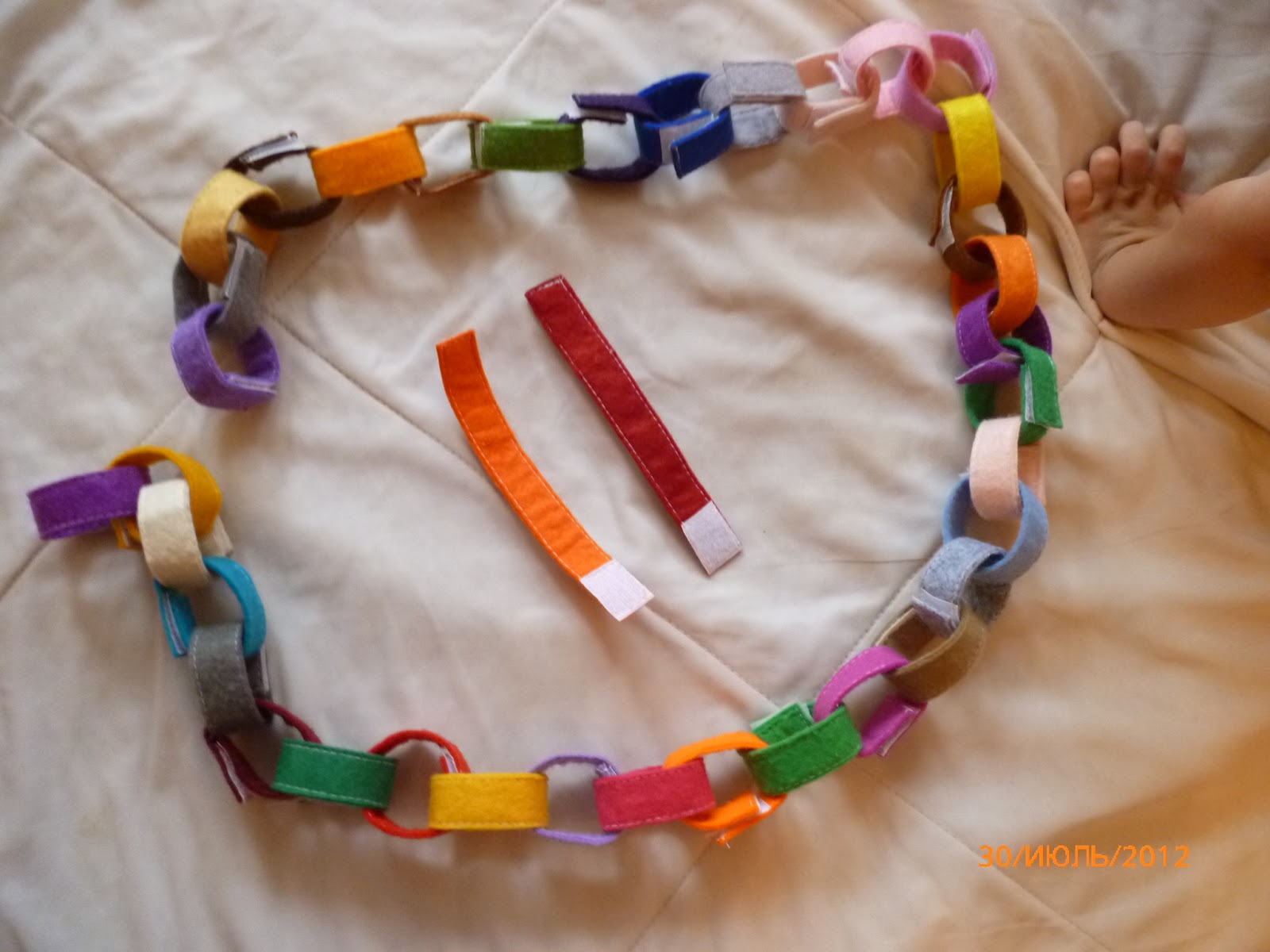 По мотивам гирлянды замечательной девушки рукодельницы, а по совместительству и хорошего логопеда Евгении http://shillopop.com/about/ сшила я эту гирлянду. Цвета взяла разноцветные, чтобы пальчики учились липучку расстёгивать и застёгивать, а глазки запоминали цвета.